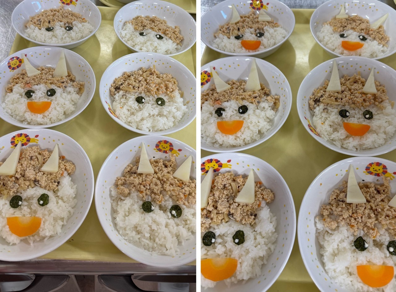 11月は昨年に続き、《くまさんのきのこごはん》可愛い可愛いくまさんを給食室みんなで作りました(^O^)/小さなクラスのお友だちは『あっ!わんわん(*^▽^*)』『そうだよね~わんわんにも見えるよね~。』でも、どのクラスも大喜びでたくさんたくさん食べてくれました(*^▽^*)