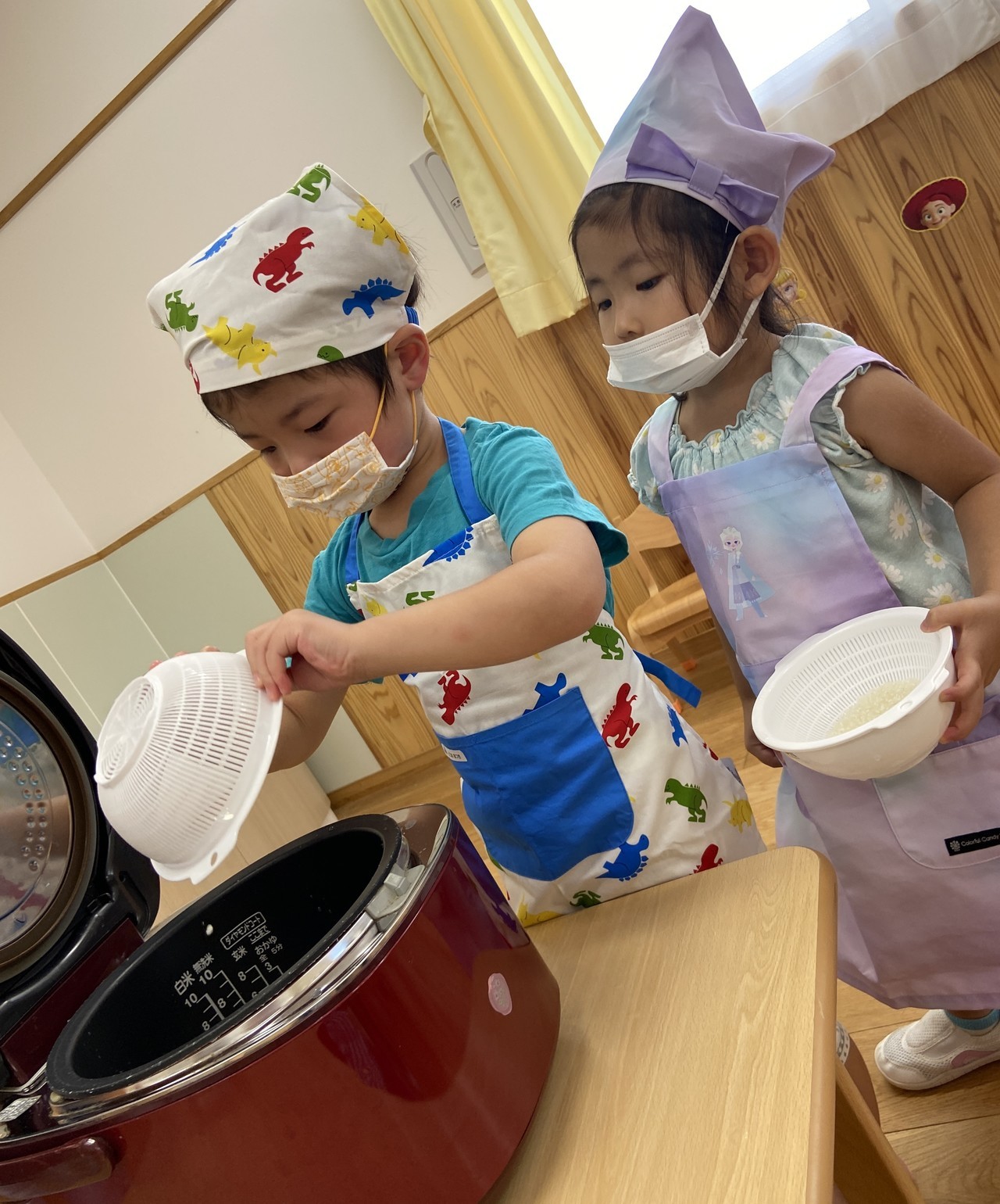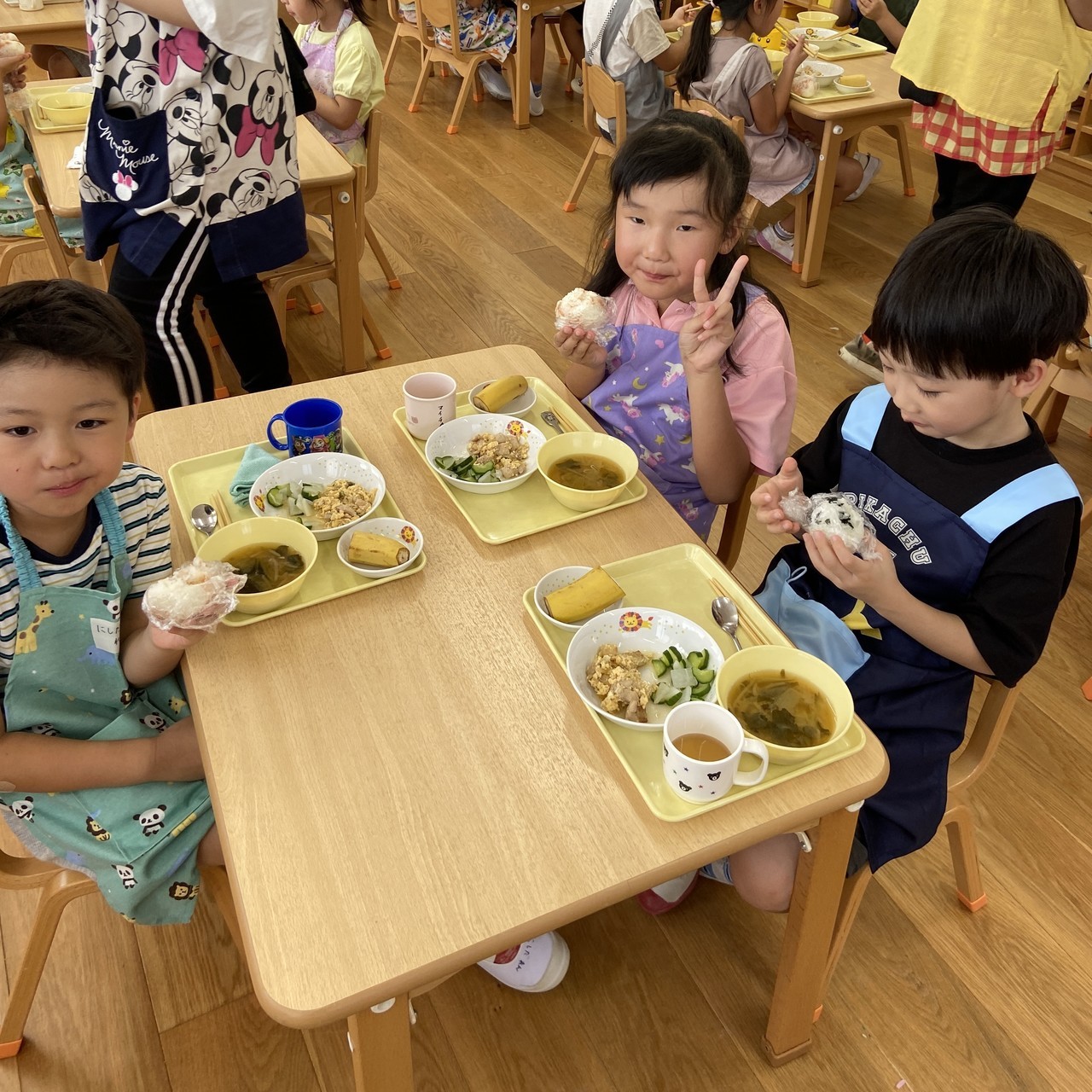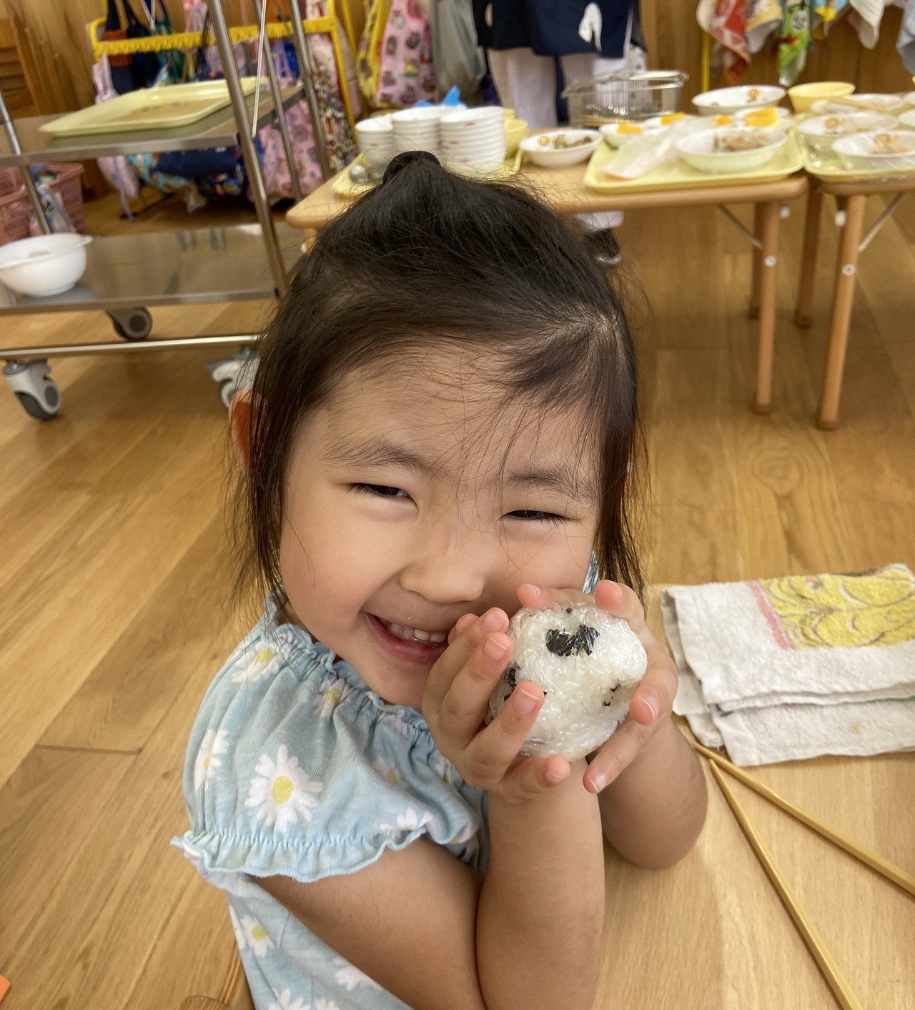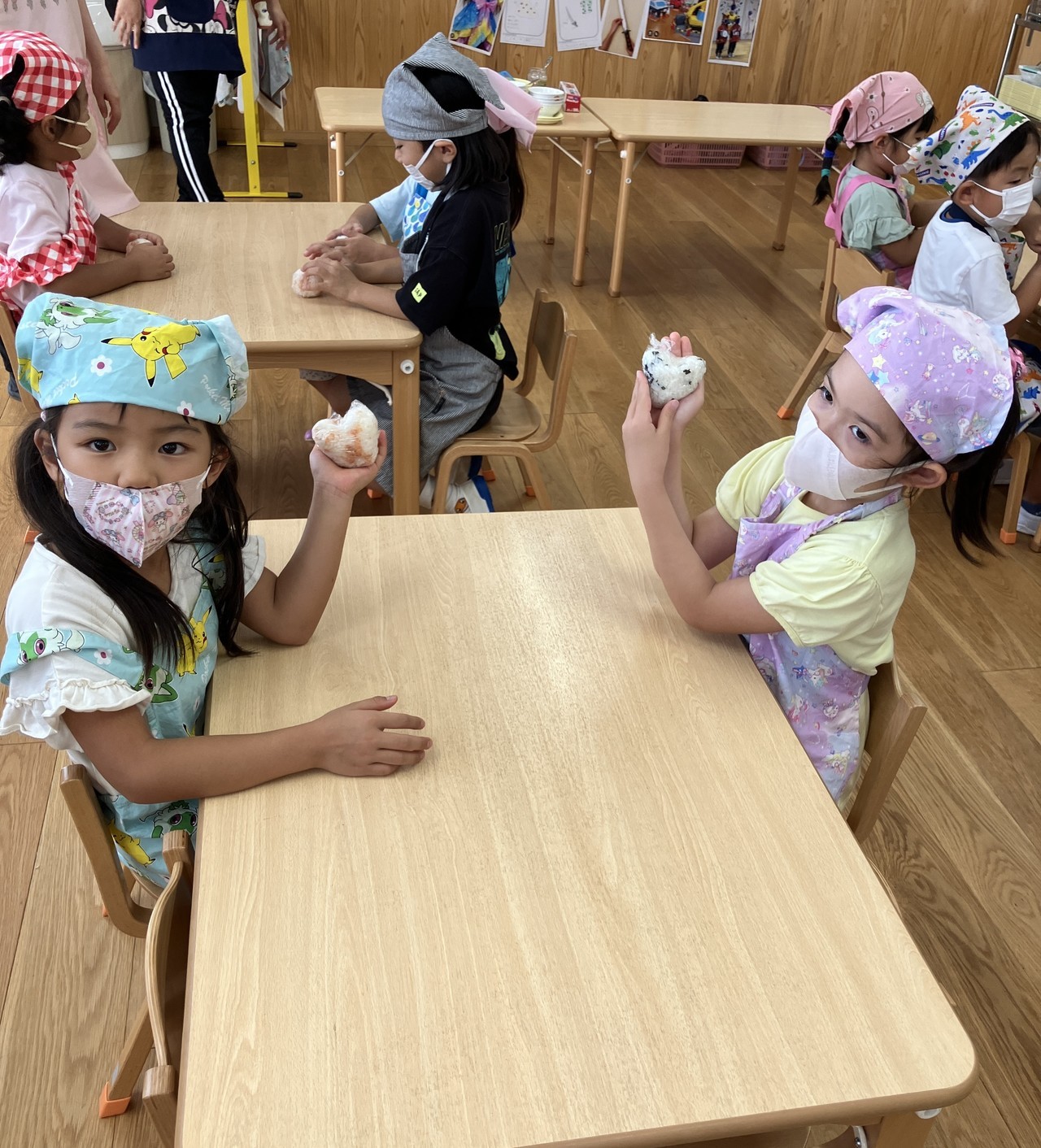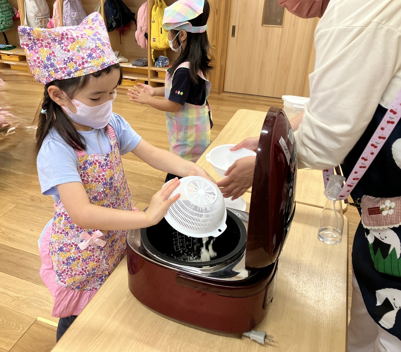 今日は、『おにぎり作り』をしました。みんな丁寧にお米を研ぎ、炊飯器のお釜の中へいれました。お米が炊き上がる間、みんなはお部屋で遊んでいたのですが、「とっても良い匂いがしたよ」と教えてくれました。炊き上がった炊飯器の蓋をパカーンとすると「うわー」と歓声が上がりました!!炊き上がったご飯は、給食の時にラップに包んで【おにぎり】にしました。一人ひとり思い思いの素敵な【おにぎり】がたくさんできました(^^♪