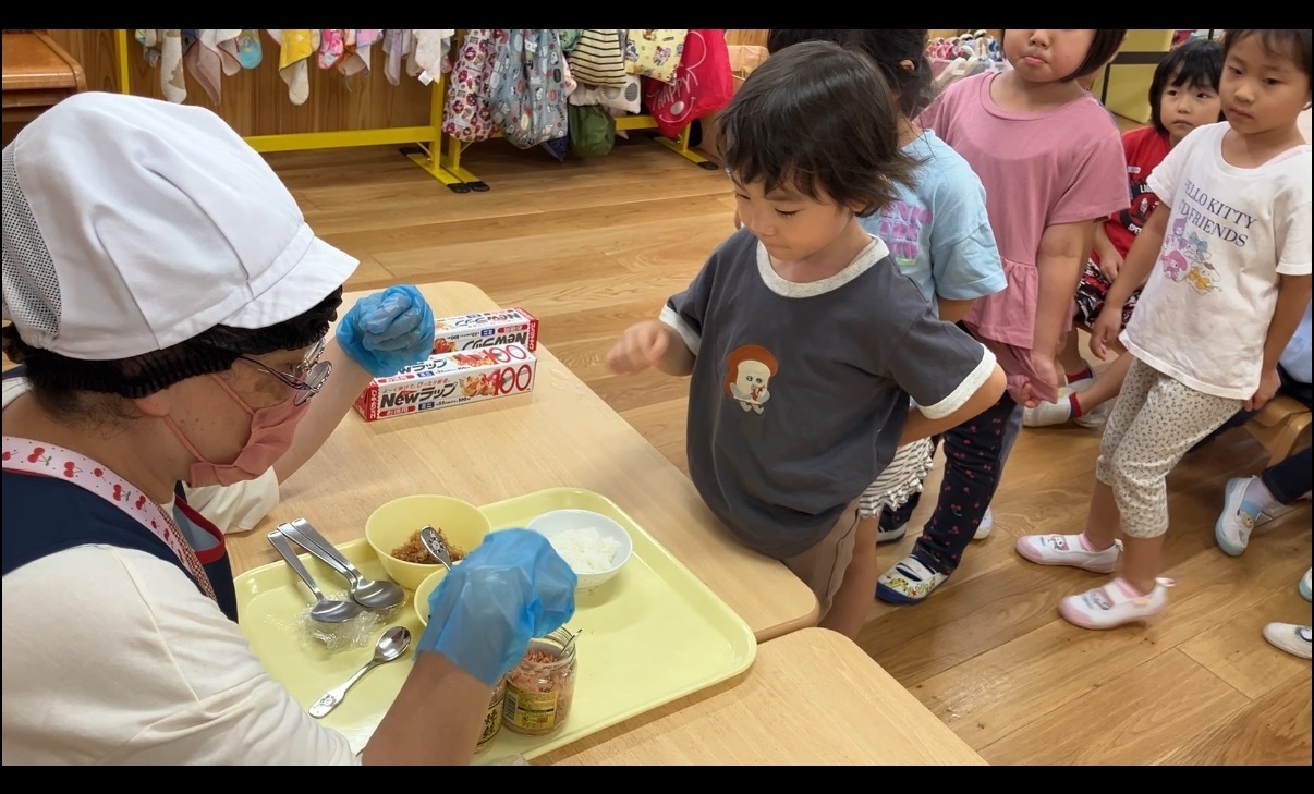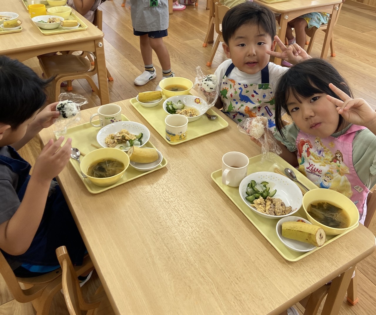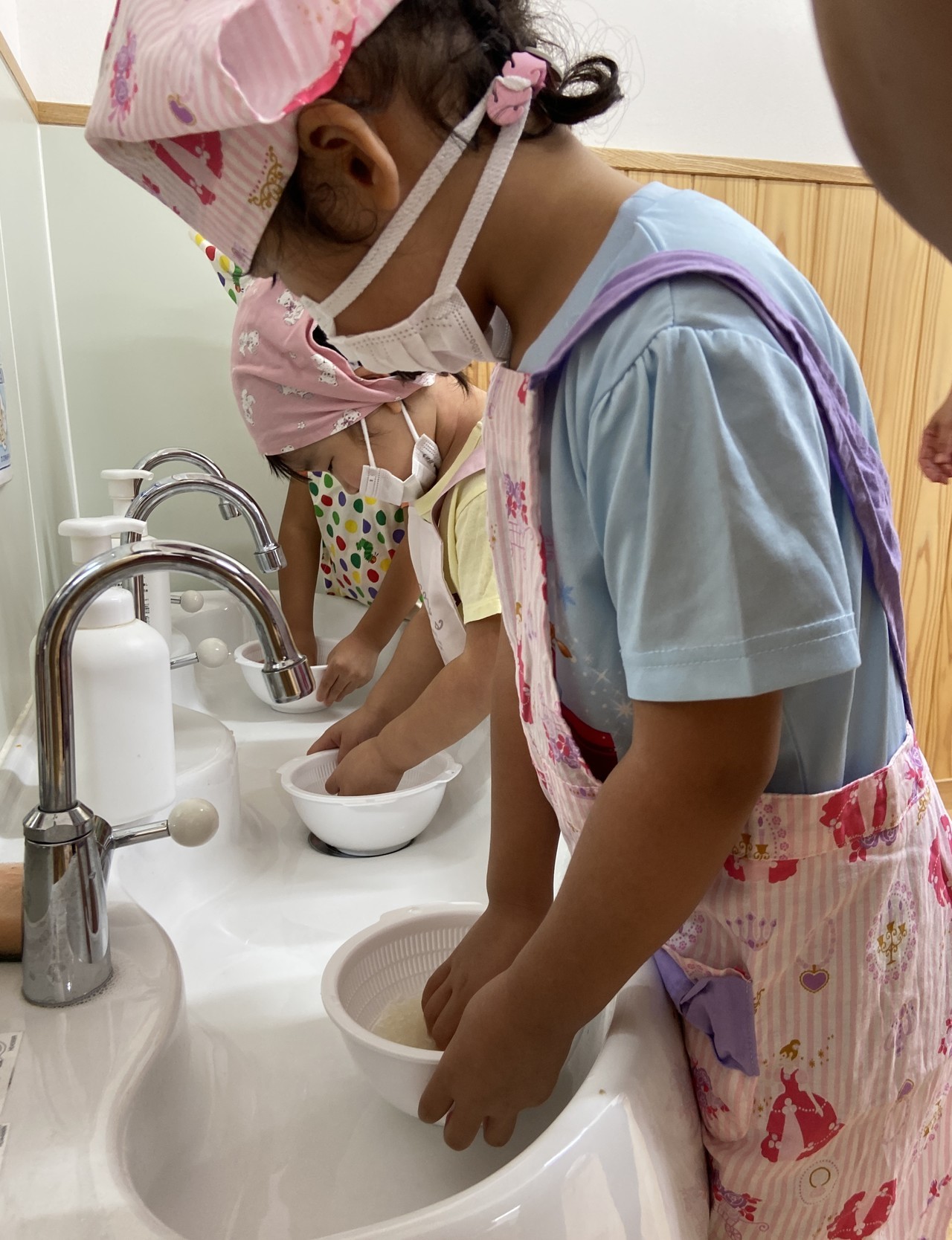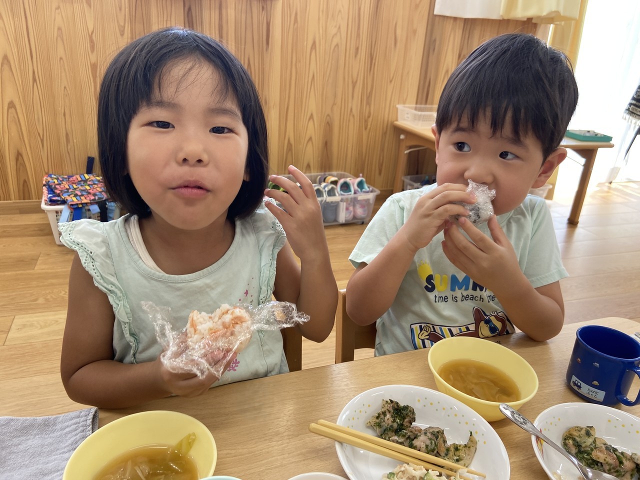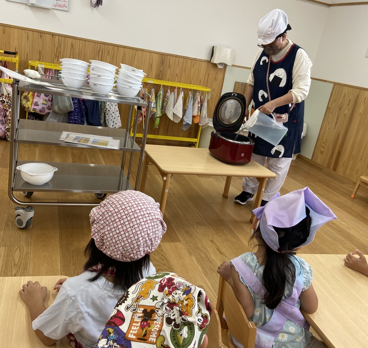 今日は、『おにぎり作り』をしました。みんな丁寧にお米を研ぎ、炊飯器のお釜の中へいれました。お米が炊き上がる間、みんなはお部屋で遊んでいたのですが、「とっても良い匂いがしたよ」と教えてくれました。炊き上がった炊飯器の蓋をパカーンとすると「うわー」と歓声が上がりました!!炊き上がったご飯は、給食の時にラップに包んで【おにぎり】にしました。一人ひとり思い思いの素敵な【おにぎり】がたくさんできました(^^♪