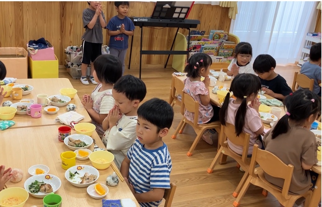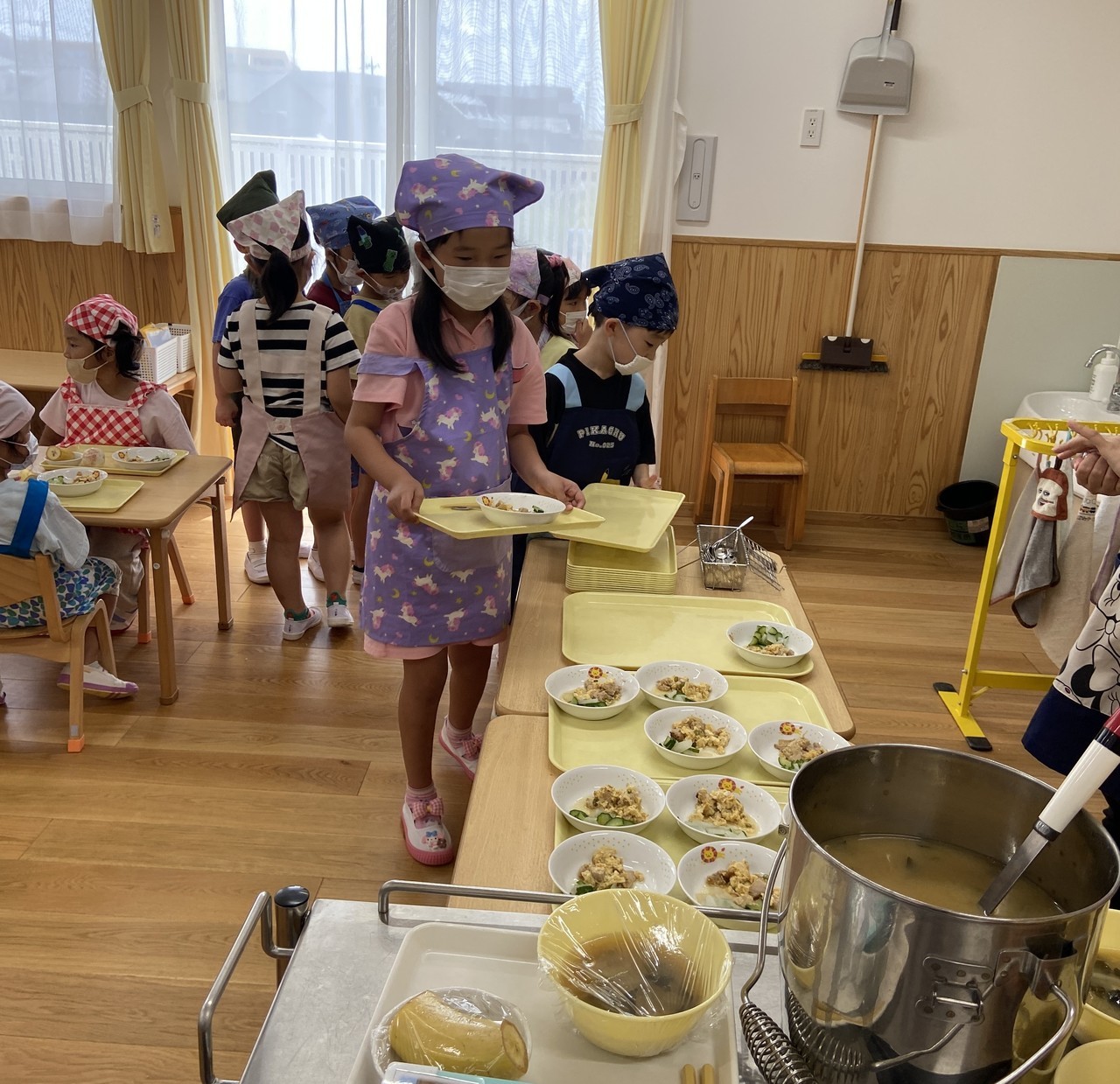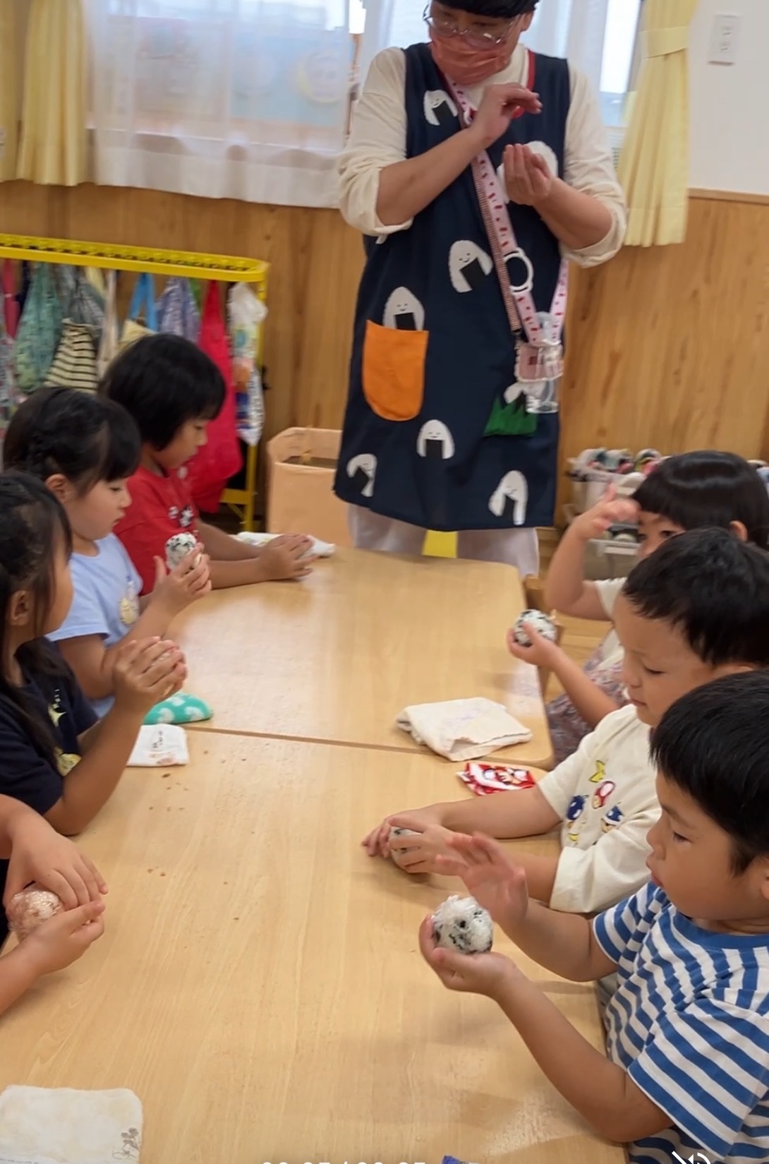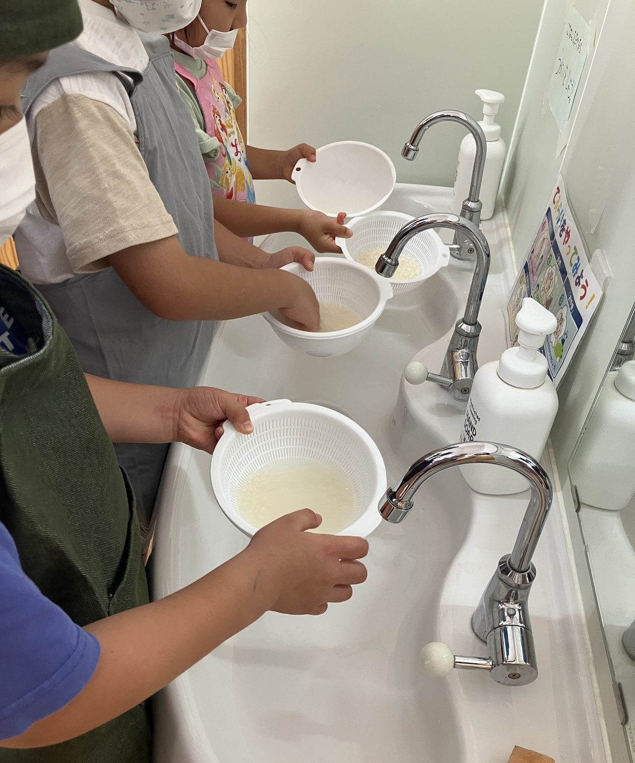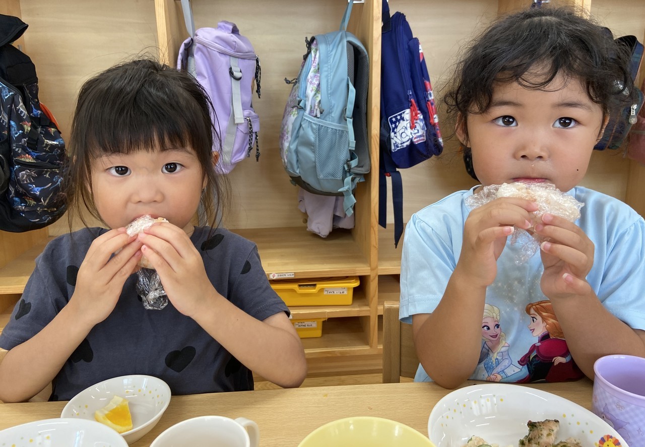 新米の美味しい季節ですね。今日はおにぎり作りに挑戦しました。まずは、一人ひとりがお米を研いで。「お米って洗うって言わないで研ぐっていうんだね」炊飯器にお米を入れて、炊飯スイッチは、お当番さんにお願いしました。炊き上がるまでお部屋に炊飯器を置いたので、炊き上がるにおいがすると、あちこちから『お腹すいたー』の声が。給食の時間にみんなそれぞれに【おにぎり】を作りました。とても美味しそうな【おにぎり】が出来上がりました。