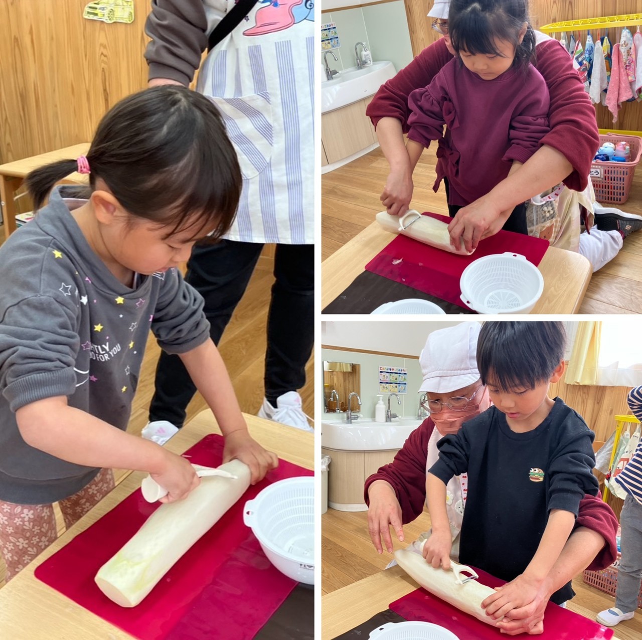 今回は、ピーラーで生のだいこんを薄く削り、乾燥用のネットで乾かします。ちょっと、雨が降ってしまい、室内干しになる時もありましたが、24日にはきれいな「切り干し大根」が出来上がりました。みんな真剣にピーラーを使い、一枚一枚丁寧に削っていました。お部屋の前のベランダで干したので、だんだんカラカラになっていくのを観察することができました。そして、出来上がった「切り干し大根」は、本日28日の給食《切り干し大根のサラダ》で美味しくいただきました(#^.^#)小さいクラスも、市販の切り干し大根より食べやすかったみたいで、サラダの残食がとても少なかったです(^_-)-☆