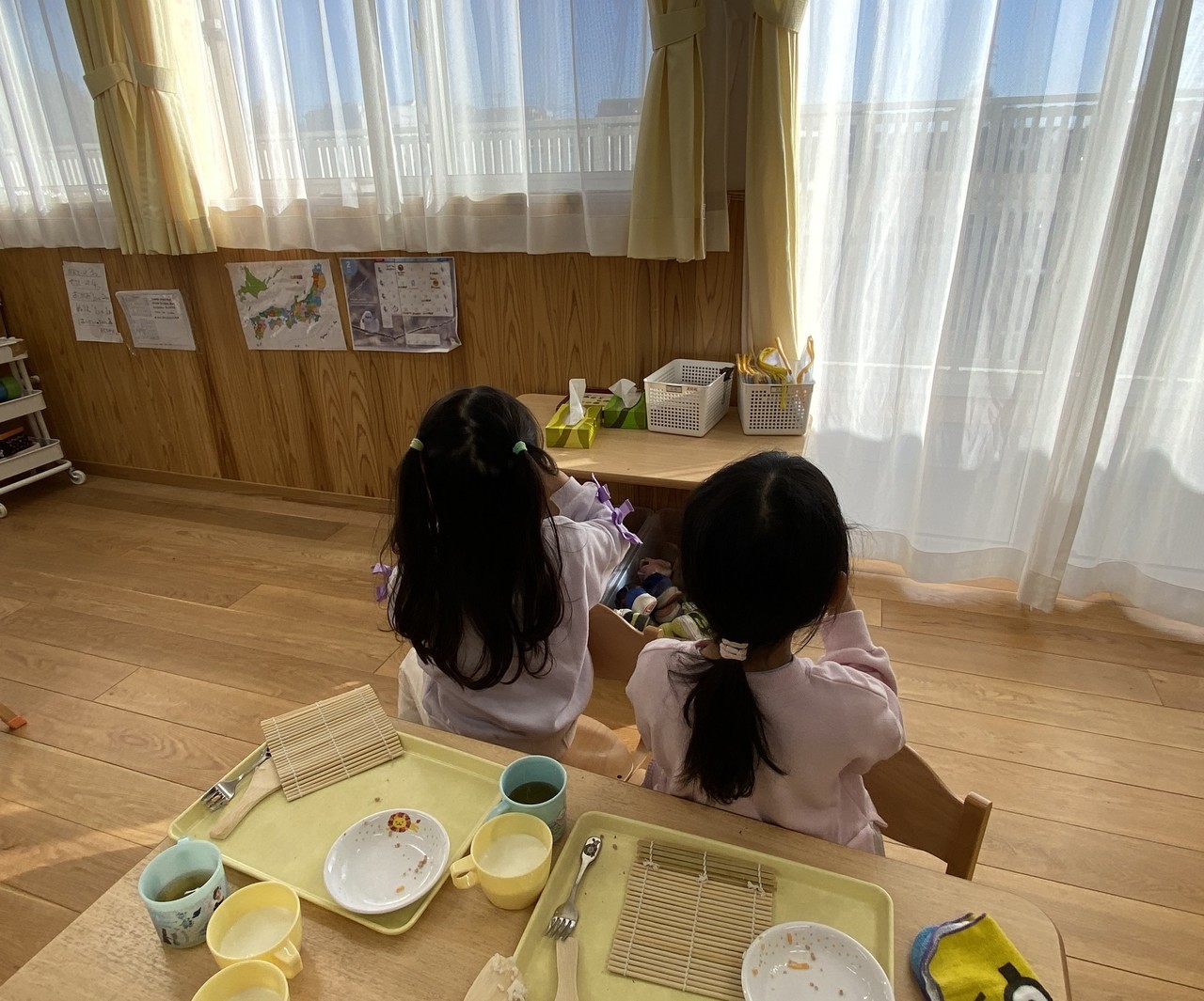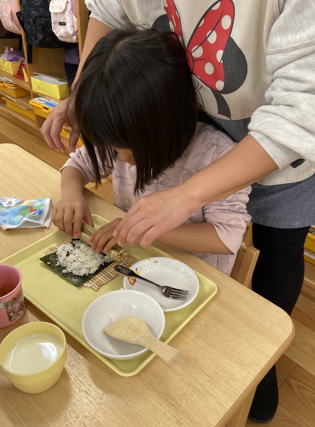 今日は、『節分』です。ということで、とら組のみんなが恵方巻作りに挑戦しました。小さな巻きすに海苔、酢飯、具材を置いて巻き巻き。それから今年の方角の「南南東」に向いてにこにこしながら食べてました(*^▽^*)