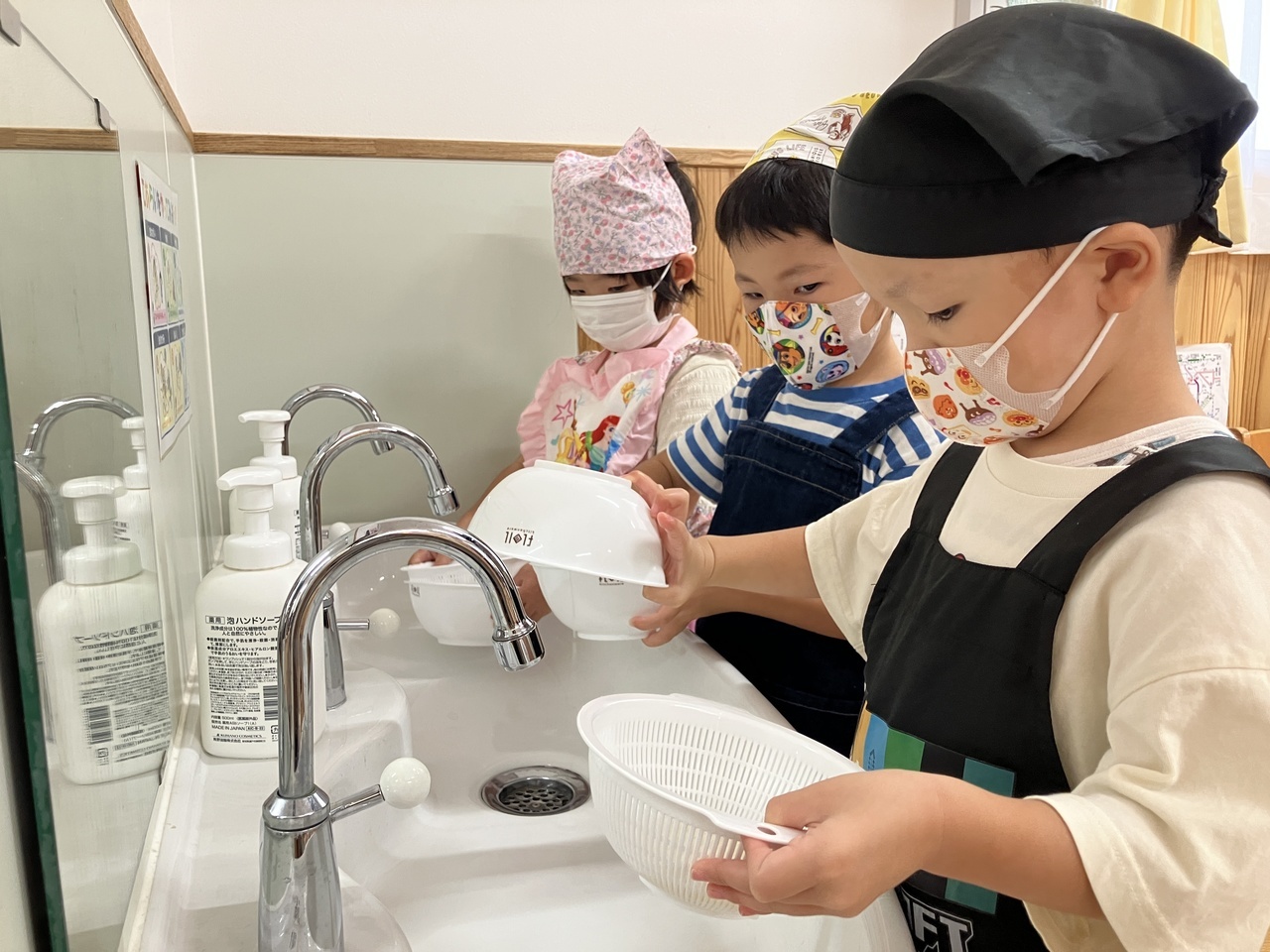 きりん・とら組一緒にカレーを作りました。にんじん・たまねぎ・じゃがいもを切っていきます。切った野菜をざるに入れてよく洗い、鍋に入れて炒めていきます。お湯を入れてコンソメを入れよく煮込んでから、火を消してカレールウを入れて、再び火をつけてすりおろしたりんご、豆乳を入れて出来上がり‼出来上がったカレーをみんなで味見しました(*^▽^*)「美味しい!」と言いながらお皿をピッカピカにして味見していました。どの子も真剣に調理をしてくれて先生たちは感動してしまいました。みんなが作ったカレーはとても美味しく、その日の給食は残食がほんとに少なかったです(#^.^#)
