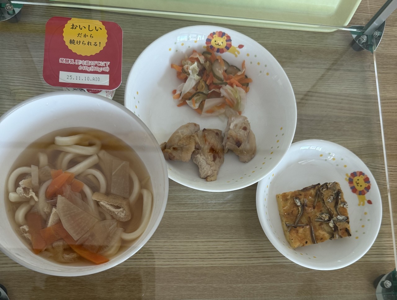 献立 ・しっぽくうどん ・骨付鶏(保育園では骨なし) ・キャベツとにんじんのサラダ