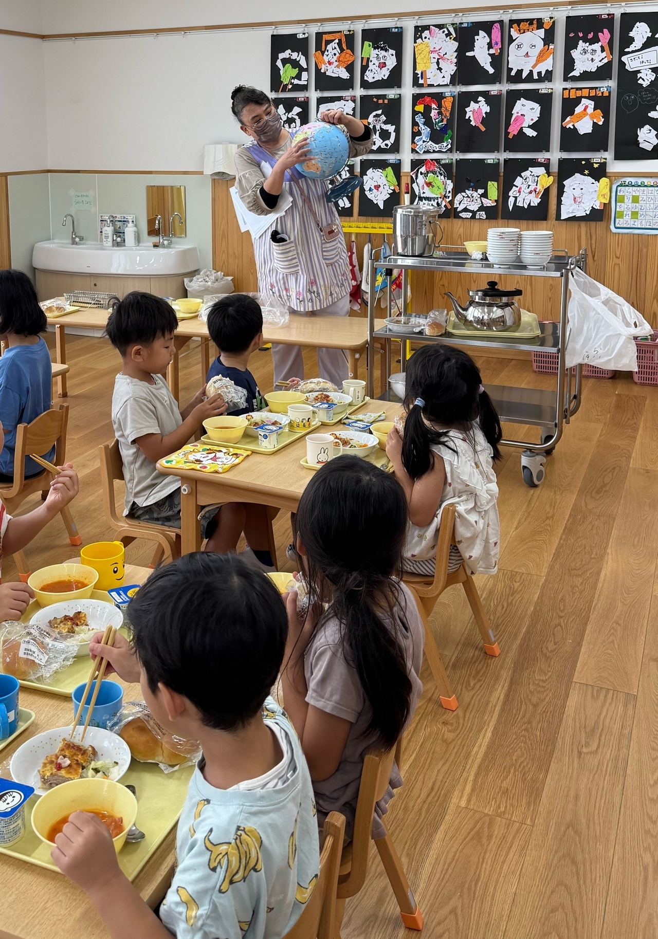 7月は、世界の料理『ペルー共和国』です。世界一美味しいと言われている料理です。今回は、「チキンミラネーサ」「ロクロ」おやつは「テケーニョス」になります。チキンミラネーサは、鶏むね肉を一つ一つ叩いて伸ばして、パン粉をつけて揚げ焼きにしました。ロクロには、かぼちゃとじゃがいも、たまねぎ、とろけるチーズが入っていて、カレー粉で味付けしてあります。ロクロは、子どもたちに人気でした(*^▽^*)世界の料理を各月紹介していますが、今回から地球儀をきりん・とら組に用意したので、日本とペルーの位置を確認したり、すごく離れているねーと感心したり、興味を持ってもらえました(#^.^#)