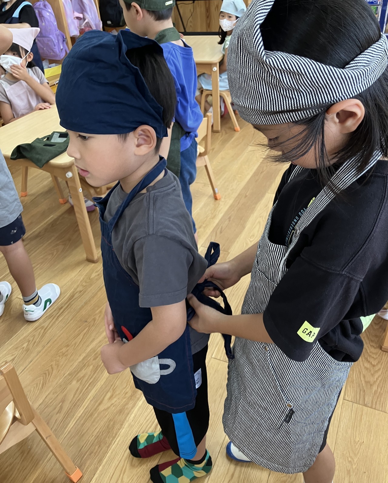 美味しい新米が出始めました(#^.^#)今日はとら組さんが新米を炊いて、『おにぎり』を作りました。まずは、お互いにエプロンの紐のを結びっこして身支度をします。一人ひとりお米を研いで、炊飯器に入れお当番さんがスイッチを入れました。美味しく炊きあがったお米に『さけ』『わかめ』『かつお節』の中から好きな具を混ぜ込み、ラップにくるんでみんな上手にきゅきゅと握りました(*^_^*)いろいろなおにぎりが出来ました。美味しい新米をたくさん食べました(^o^)/