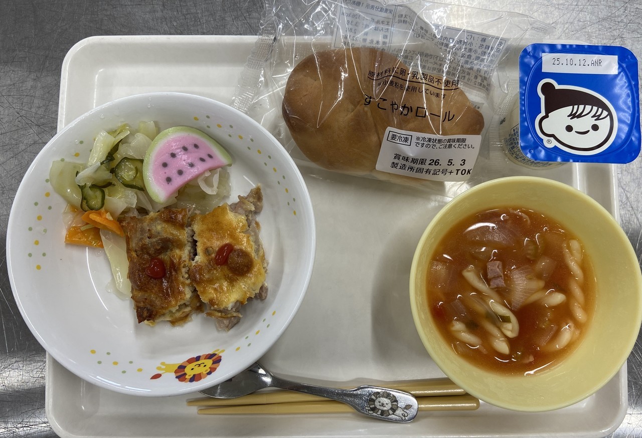 献立 ・ロールパン ・ポークピカタ ・キャベツのイタリアンサラダ ・ミネストローネ