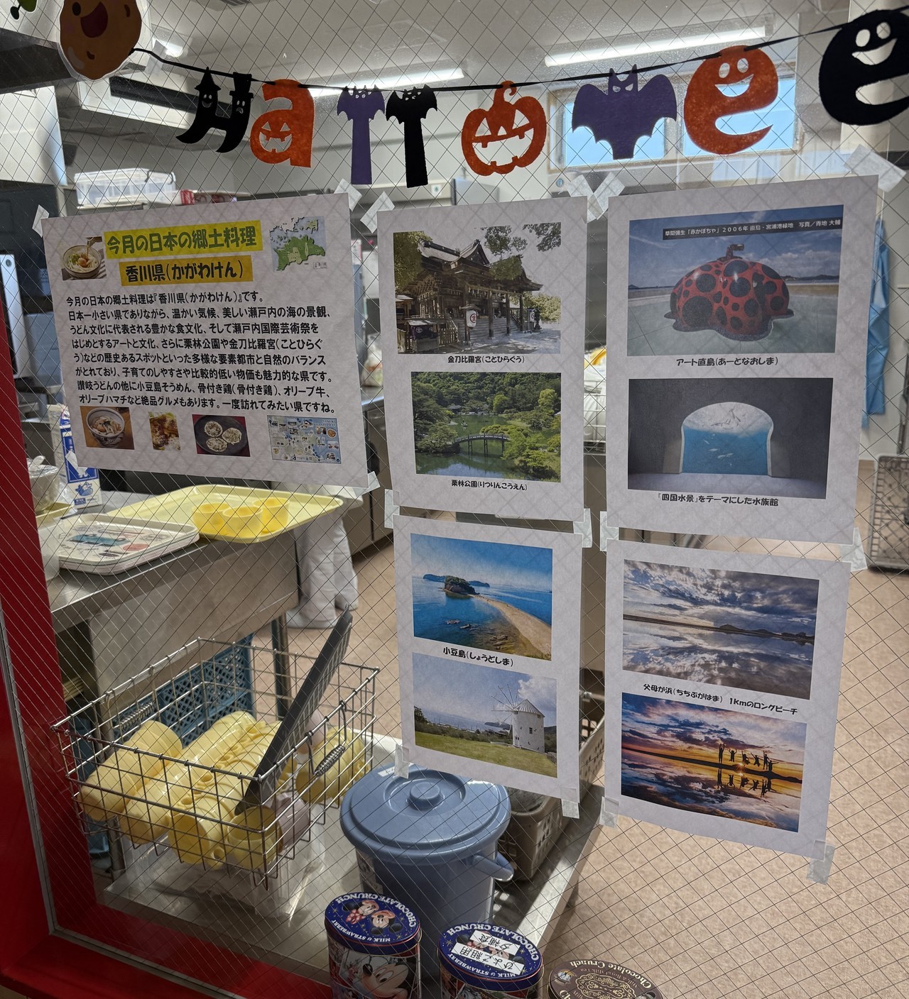 10月は、四国の『香川県(かがわけん)』です。日本一小さい県ですが、うどんが美味しいのが有名ですね。今回は、たくさんの野菜、油揚げや豆腐の入った「しっぽくうどん」を紹介してみました。そして、にんにくしょうゆのきいた骨付鶏。保育園では、小さいクラスもいるので、骨なしのお肉を用意しました。おやつの「にくてん焼き」は、ちょっとアレンジして食べやすくしました。もともと煮干しが大好きなおのざきスマイルのお友だち。たくさん食べてくれました(*^_^*)