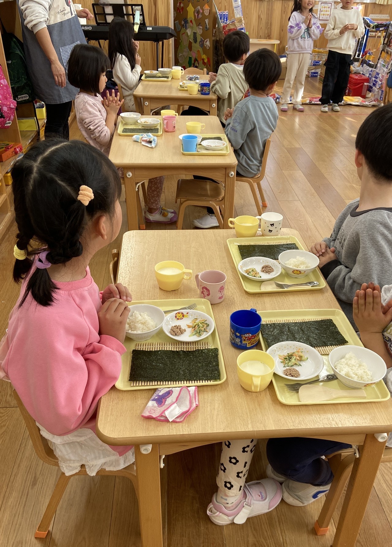 11月24日は、『和食の日』《いい(11)に(2)ほんしょく(4)》のごろ合わせから制定された記念日です。2013年12月に『和食;日本人の伝統的な食文化』がユネスコ無形文化遺産に登録されたのを受けて、日本の食文化にとって大変重要な時期である秋の日に、毎年、和食文化の大切さを再認識するきっかけになっていくよう願いが込められています。保育園では、ぱんだ・きりん・とら組が和食の一番大事なだしについてお話を聞いてから、実際にだしの試飲やクイズ・かつお節削りなどを体験しました。だしを取るときに使うかつお節やこんぶ、にぼしなど美味しい美味しいと試食していました(*^▽^*)その日の給食で出たみそ汁を飲んで、とら組さんが『だしの味がする~』さすが、とら組(^o^)/