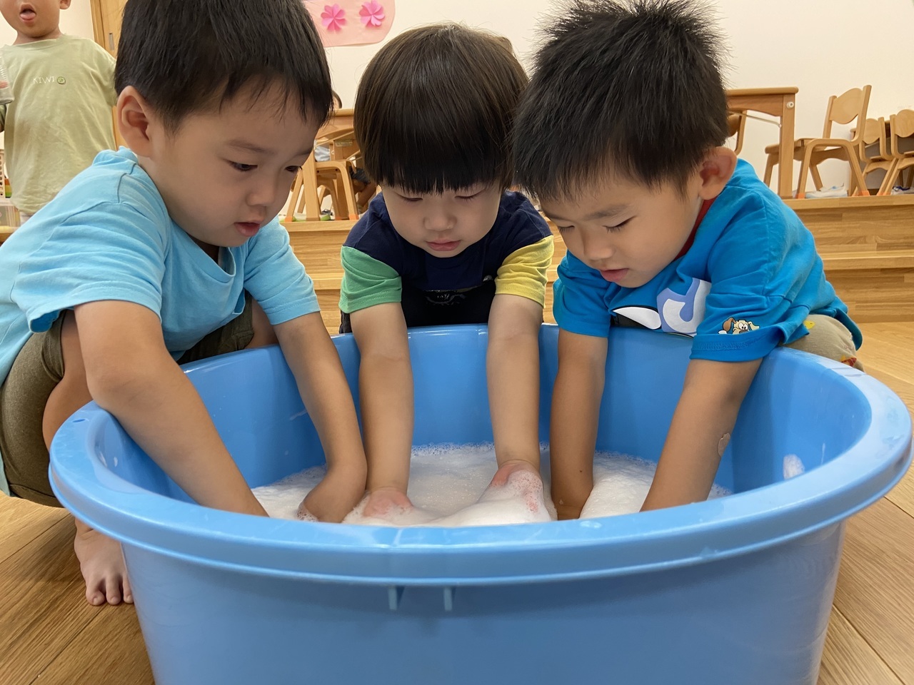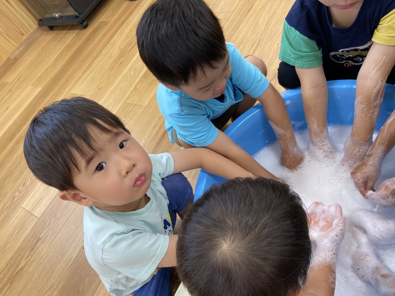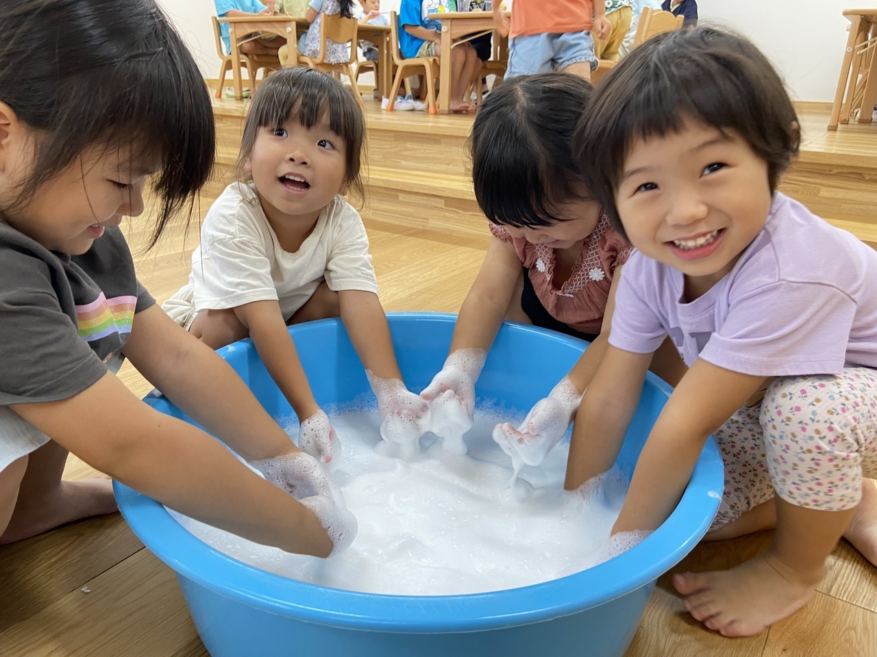 みんなでせっけんを泡立ててモコモコの泡をたくさん作りました♪