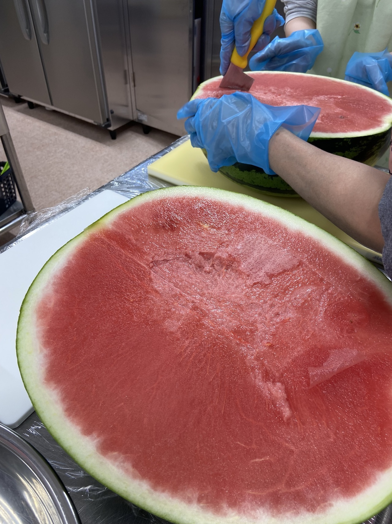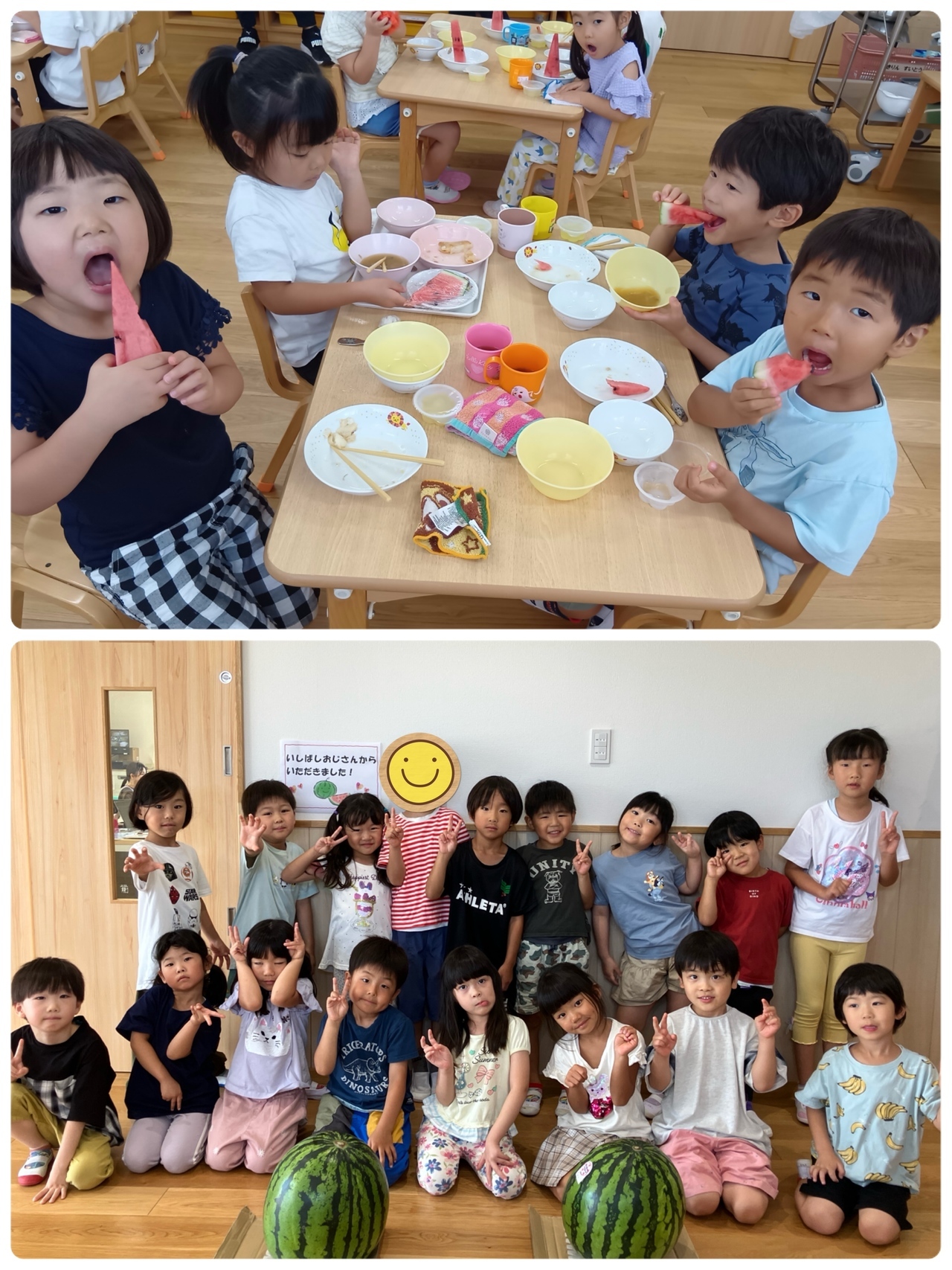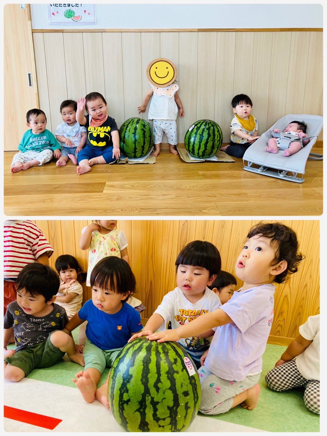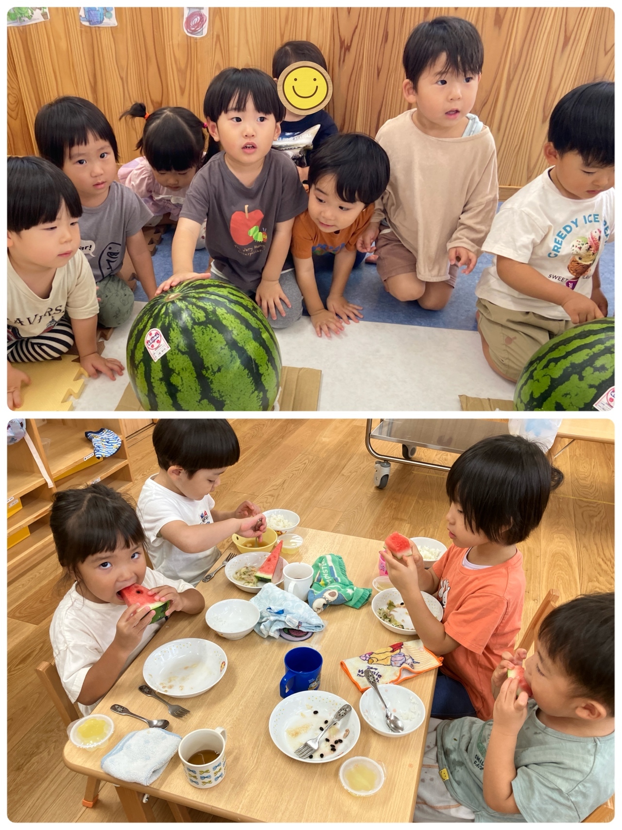 いただいた大きなすいかをみんな嬉しそうに食べていましたよ(^-^)♡なでなでしたり、「おいしくなーれ!」と呪文を唱えながらスイカと写真を撮っていました♪大きなお口でかぶりつく姿が見られました♪