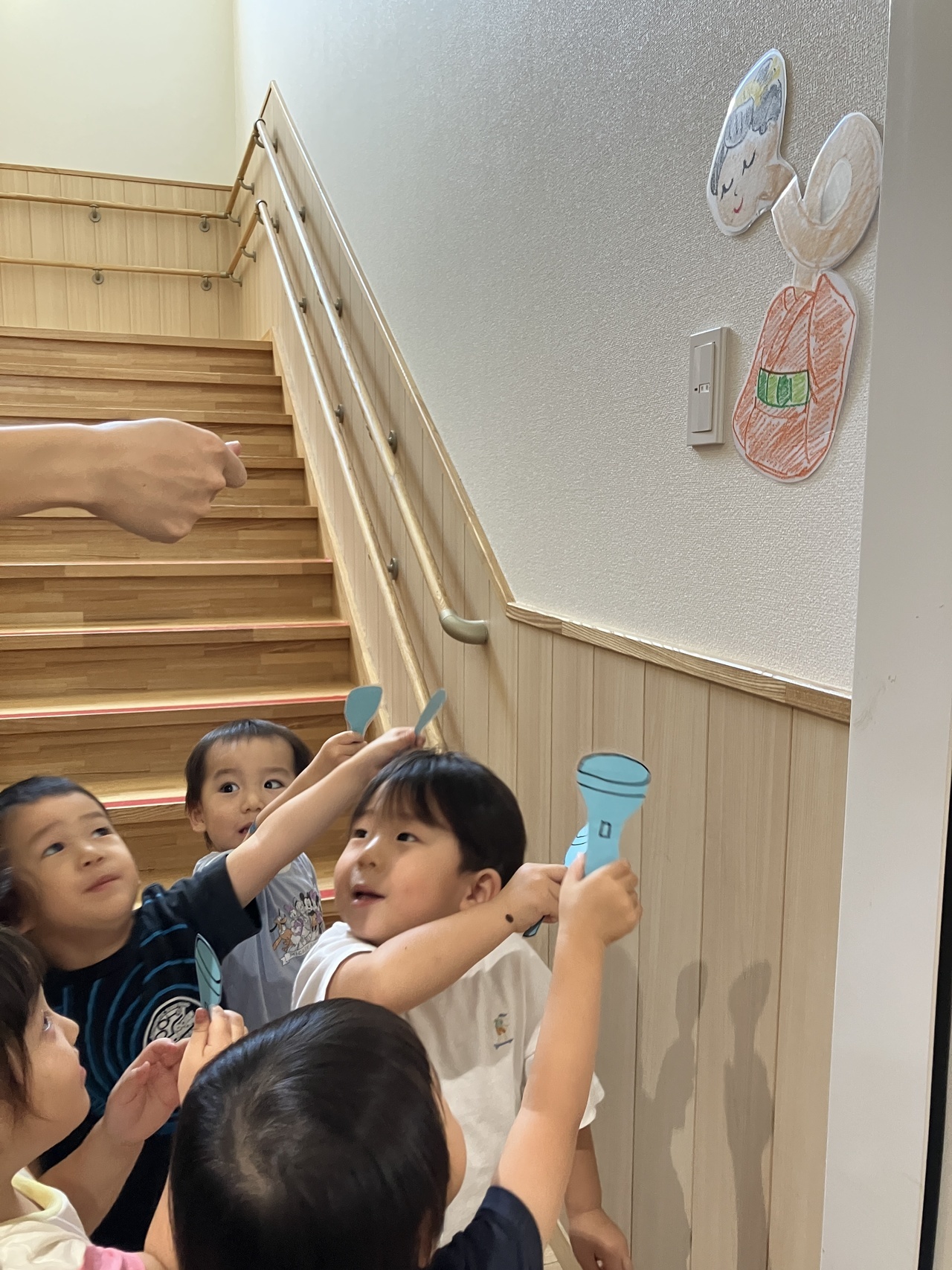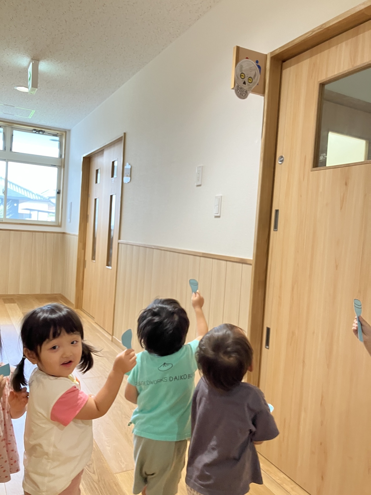 みんなと遊びたくてやってくるおばけをさがしにライトを持って持って廊下へGO!!