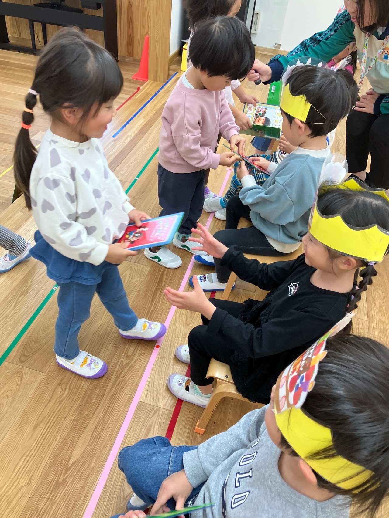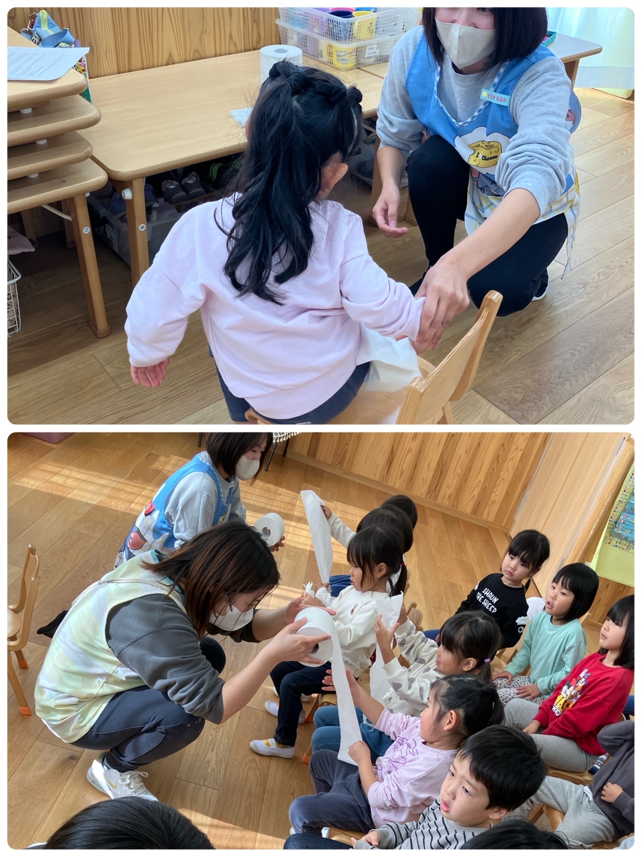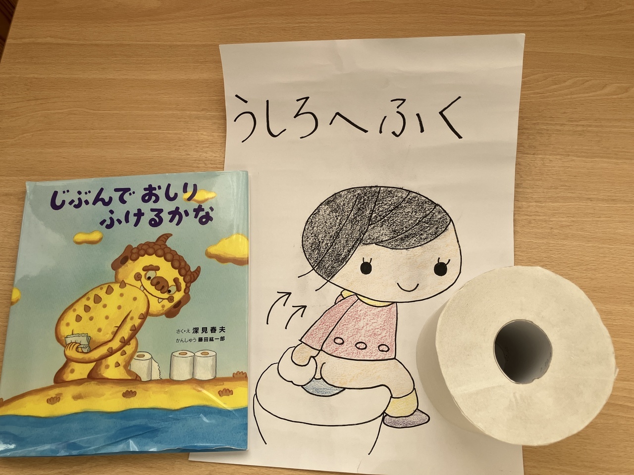 看護師の先生がイラストや絵本を使っておしりの拭き方を教えてくれました(^-^)!みんな興味をもってお話を聞いていましたよ♪実際にトイレットペーパーを使っておしりの拭き方の練習をするとみんな上手に手をうしろにまわしていました!