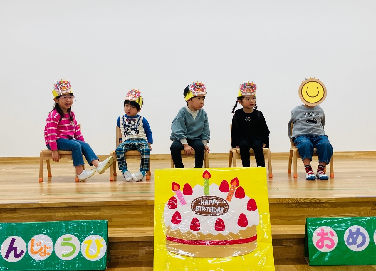 今月は10名のお友だちのお祝いをしました(^-^)vインタビューの後はみんなでボール運びリレー!!みんなで楽しく体を動かしました♪たくさん食べて、たくさんからだを動かして大きくなりますように…♬